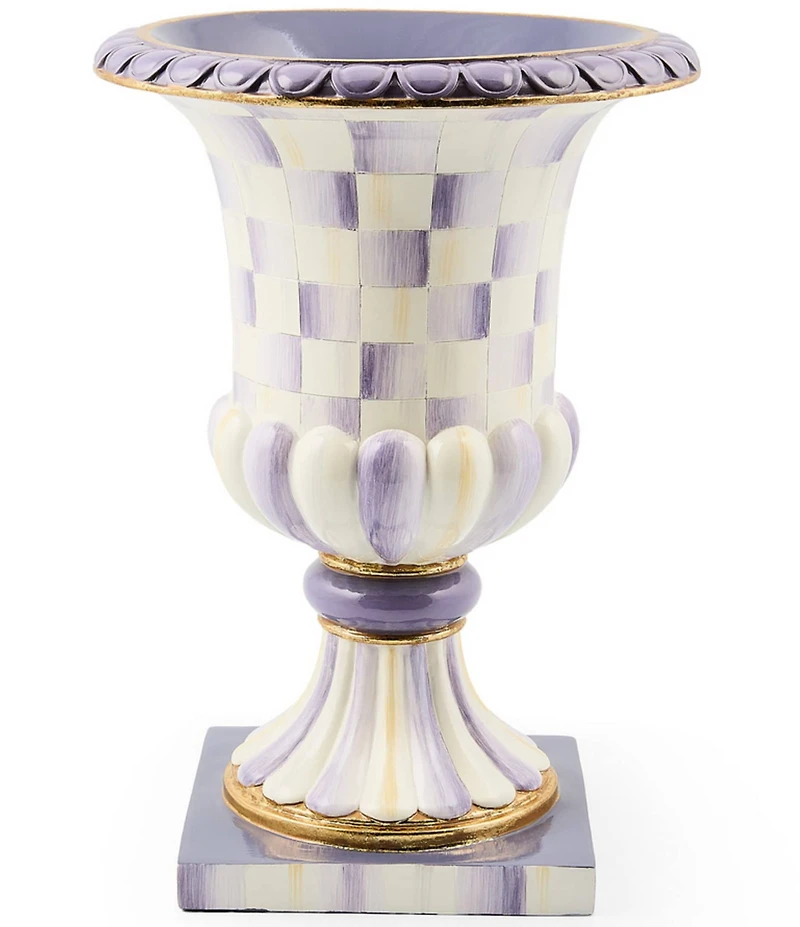 From MacKenzie-Childs, this Pedestal Tabletop Urn Decor features: Hand-painted with our rich purple and white pattern with golden embellishments Crafted form resin Approx. 9.5" dia., 13.5" tall Pieces may vary due to the handmade nature of each product Wipe with a soft, dry cloth. Imported.