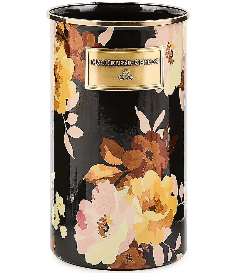 From MacKenzie-Childs, the Wild Rose Utensil Holder features: Our extra-tall Wild Rose Brown Utensil Holder is the perfect container for everything from slotted spoons to crafting tools. It features our hand-applied floral transfers on a steel underbody and is rimmed in bronzed stainless steel. Elegant, useful, and crafted in our signature style. Pair with pieces from Mocha Check or go Wild Rose all the way! Heavy-gauge, hand-glazed steel underbody with hand-applied transfer decoration, rimmed in bronzed stainless steel Approx. 5" dia., 8.5" H Pieces may vary due to the handmade nature of each product Wipe with a soft damp cloth If needed, hand-wash with mild soap and dry immediately Do not microwave Our enamelware exceeds both federal food safety regulations and California's Proposition 65, the strictest environmental safety standards in the U.S. Handle enamelware with care and discontinue use for food service if it becomes chipped, cracked, or broken Imported.