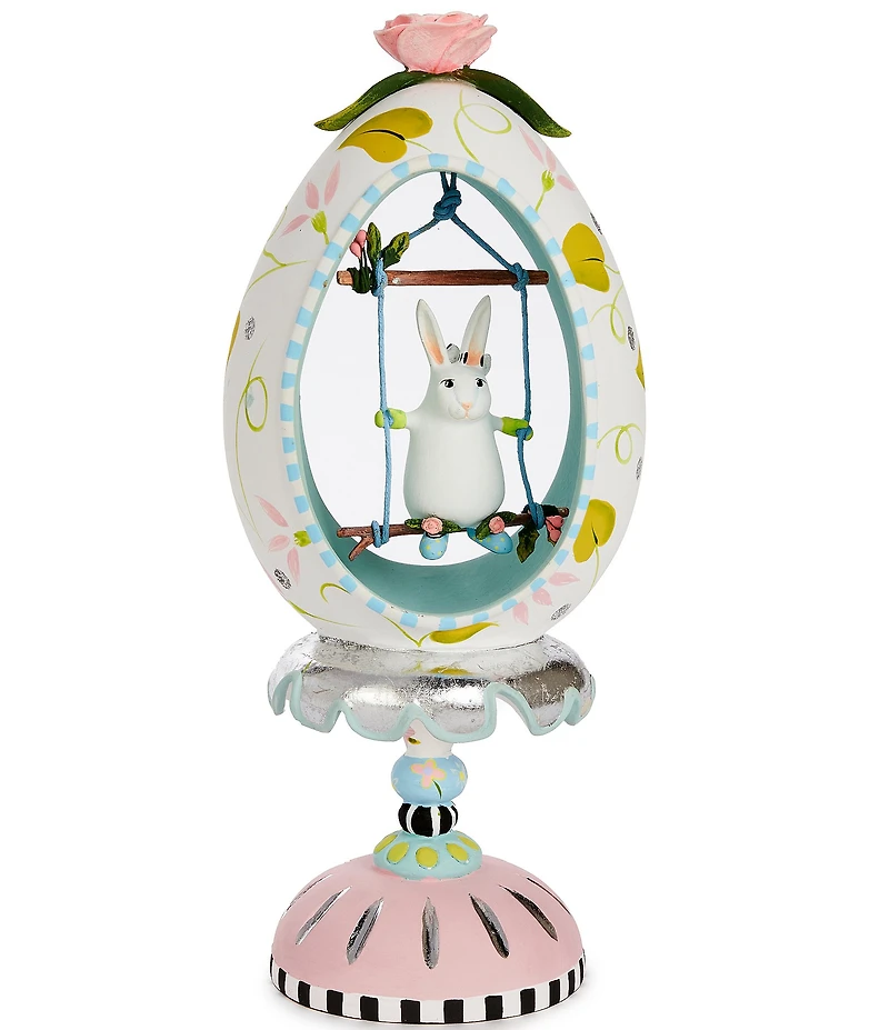From the Easter collection by MacKenzie-Childs x Patience Brewster, this figurine features: A miniature rabbit atop a spring swing, nested within a candy-colored egg Crafted from resin Approx. 4" wide, 3.5" long, 10.5" tall Wipe with a soft, dry cloth Imported.