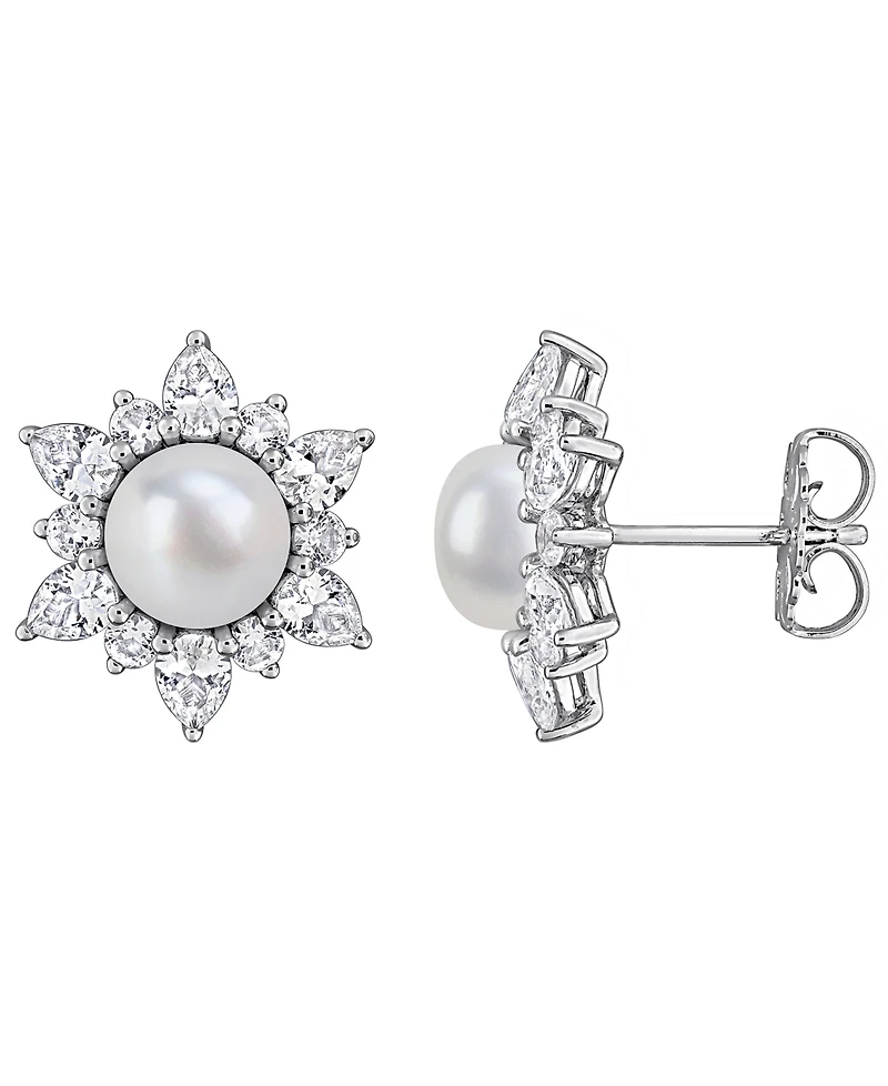 Macy's Cultured Freshwater Pearl & Created White Sapphire (3-3/8 ct. t.w.) Earrings in Sterling Silver