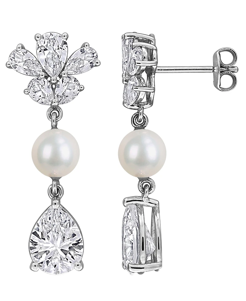 Macy's Cultured Freshwater Pearl & Created White Sapphire (8-7/8 ct. t.w.) Drop Earrings in Sterling Silver