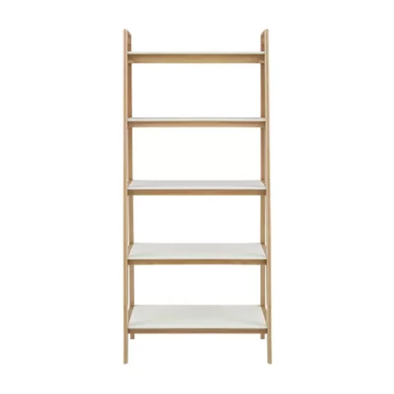 Add the bold madison park avalon shelf to your living space. This all wooden mid century inspired shelf will go nicely to any room's decor. It features 5 off white shelving composed of solid wood held by a natural wood finish frame. The two tone gives this shelf a striking contrast. Use this shelf to display your decorative pieces and elevate your home decor.