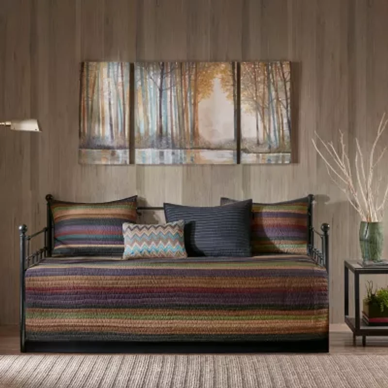 Create a warm and inviting space in your guest room with the Madison Park Sequoia 6 Piece Reversible Daybed Cover Set. This quilted daybed cover features a multicolor stripe print with a pin-striped reverse to create a chic lodge-inspired look. The 3 reversible shams repeat the patterns seen on the daybed and feature tie closures on the sides, adding a charming accent. An oblong decorative pillow with a multicolor chevron stripe pattern and a solid bedskirt add the finishing touches to this reversible daybed set. Machine washable for easy care, this daybed cover set easily fits a Twin size mattress.