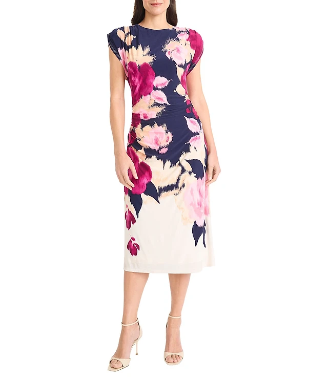 Maggy London ITY Floral Crew Neck Cap Sleeve Side Ruched Sheath Midi Dress