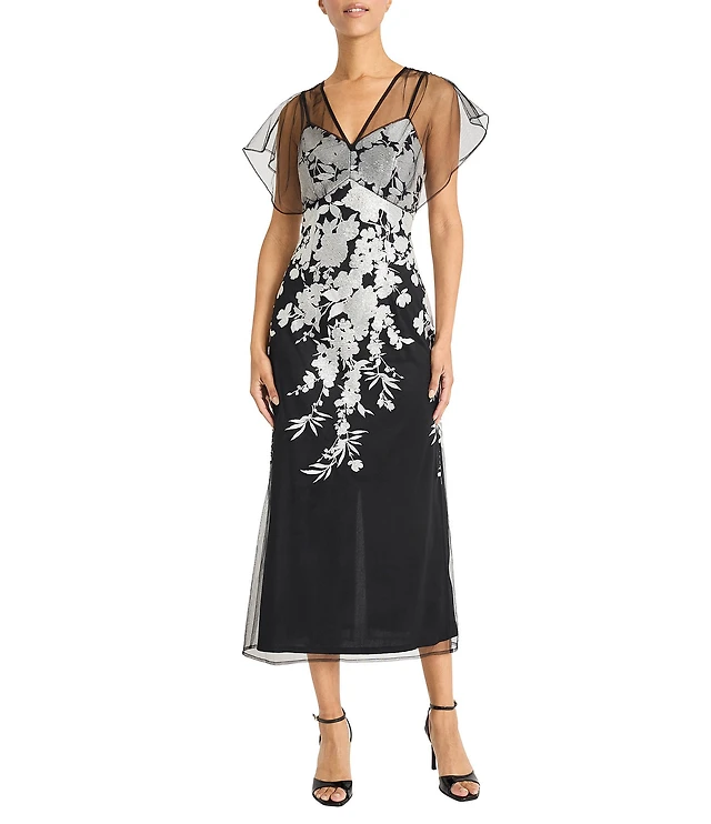 Maggy London V-neck Short Sleeve Floral Sequin Embellished Mesh Sheath Midi Dress