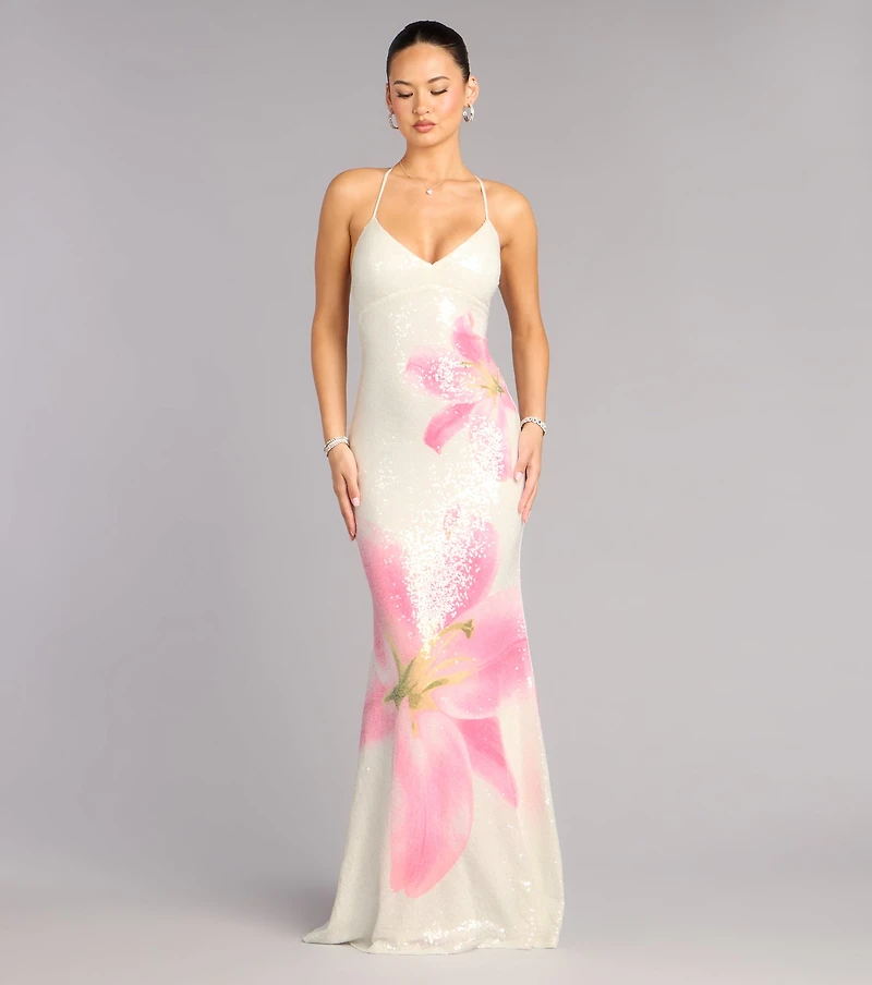 Cue the compliments in the Maia sequin mermaid dress that shimmers with a dreamy floral print that feels straight out of a getaway moment. The sculpted silhouette hugs in all the right places, while delicate straps and an open lace-up back keep it effortlessly alluring.