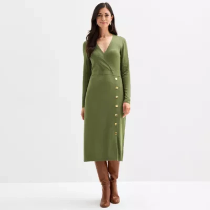 This Maia women's long-sleeve sweater dress is a chic style for fall and winter. Made from a soft knit, this midi dress has a flattering v-neck, a close fit and gold-tone buttons. Wear it with boots and gold-tone jewelry.