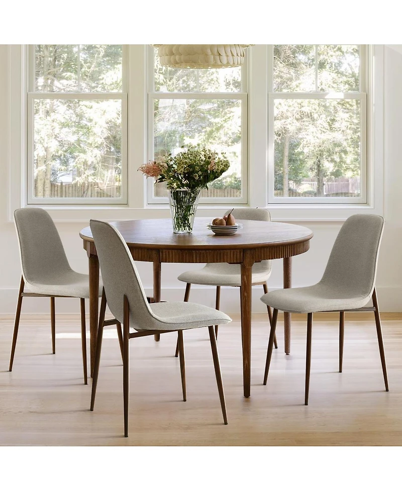 Update your dining room with this set of 4 upholstered fabric dining chairs featuring a warm walnut-tone, wood-look metal leg finish. Designed as armless side chairs, they slide easily under most dining tables and work well as kitchen table chairs for apartments, breakfast nooks, and open-concept spaces. Each chair offers a cushioned foam seat and supportive full back for comfortable everyday dining, brunch, and entertaining. Built on a sturdy metal chair frame with angled tapered legs, this modern dining chair set blends clean lines with durable, easy-care materials.