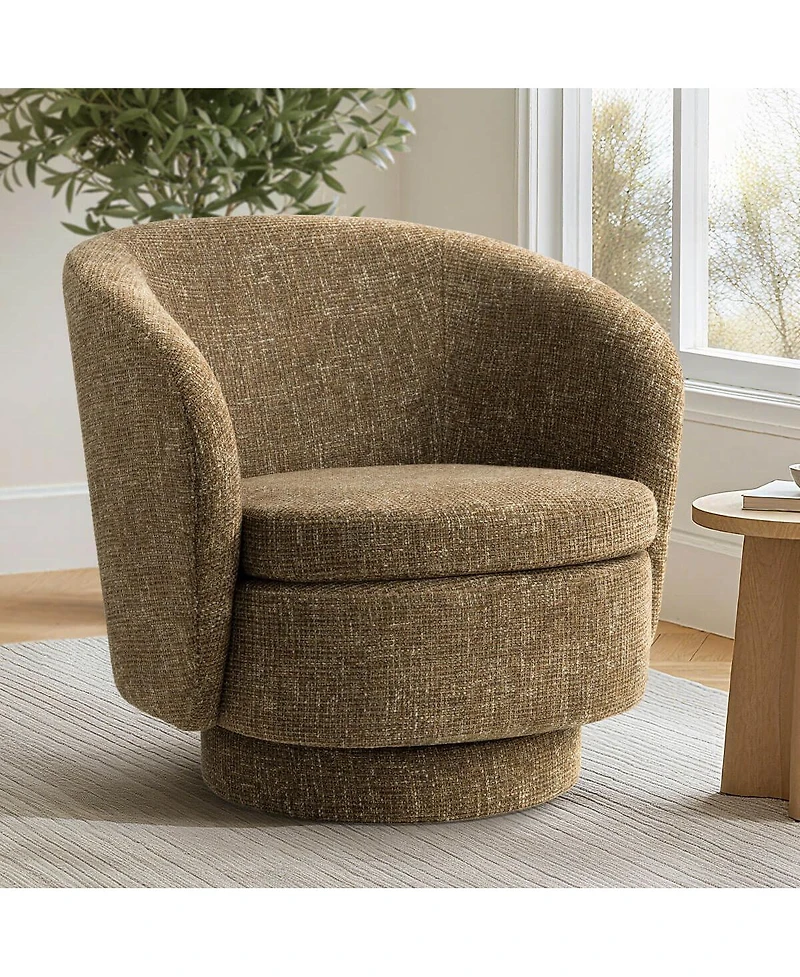 Create a grounded, boutique-hotel vibe with this 30.5" swivel tub accent chair. The upholstery features a rich woven fabric texture that looks dimensional and elevated—ideal for searches like woven fabric accent chair, textured swivel chair, tub chair for living room, and modern barrel lounge chair. A wide curved back with wraparound arms offers an inviting, tucked-in feel, while the thick seat cushion provides comfortable support for reading, gaming, or coffee chats. The 360-degree swivel base turns smoothly so you can face the conversation, the fireplace, or the window without lifting or dragging the chair. Built with an Mdf (Medium-Density Fiberboard) frame for stable everyday use. Includes 1 chair.