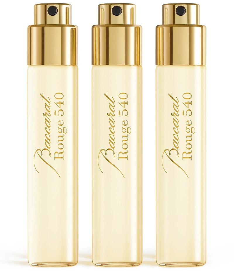 A trio of 0.37-oz. travel-sized Baccarat Rouge 540 Eau de Parfums. Globe Trotter travel spray refill case available, sold separately. Baccarat Rouge 540 eau de parfum is born from the encounter between Maison Francis Kurkdjian and Baccarat to celebrate the crystal manufacturer's 250th birthday. The woody scent releases a poetic alchemy, a highly condensed and graphic olfactory signature. Breezy jasmine facets, radiant saffron boost the ambergris mineral notes and the woody tones of freshly-cut cedar. Bright and sleek, Baccarat Rouge 540 eau de parfum caresses the skin like an amber and woody floral whisper. Olfactory Family: Woody ambery floral Top Notes: Jasmine and Saffron Heart Notes: Cedar wood Base Notes: Ambergris accord This product contains natural extracts. The presence of suspended particles or color variations do not alter its quality in any way. Protect from direct light and sources of heat.