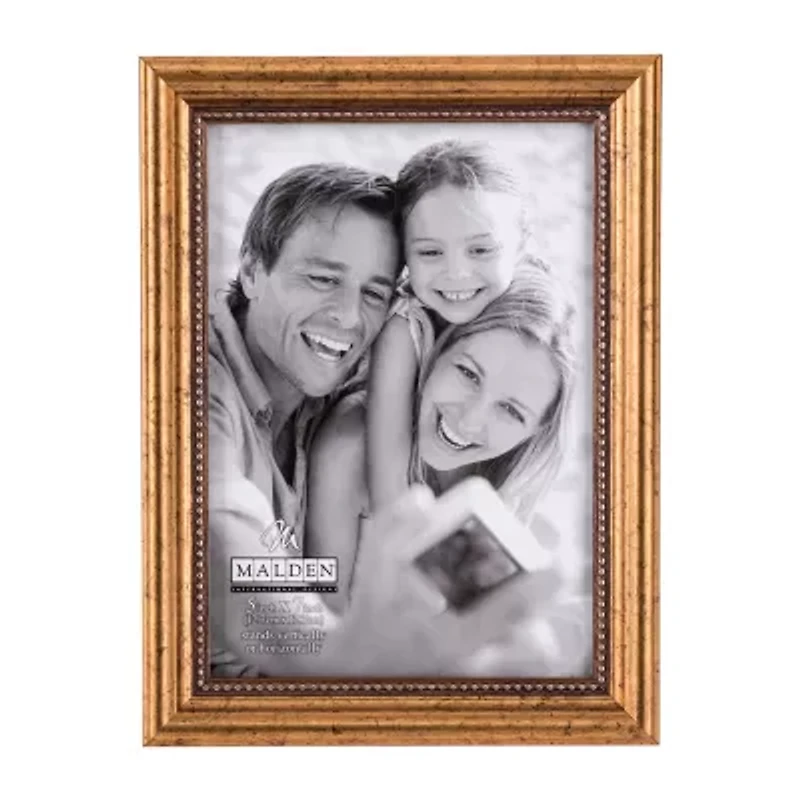 Showcase your classic style and favorite memories with this beaded gold frame. This beautiful frame is the perfect way to display your treasured photos. Frame is constructed of PS with a gold finish and beaded design on the frame's inner border. This frame holds a 5" x 7" inch photo in a 4.5" x 6.5" inch display opening and displays horizontally or vertically on any wall. It includes hardware on the back for easy hanging. A durable glass front will protect and showcase your precious memories for years to come. Simple to load with high quality turn tabs and a sturdy back panel. This stunning gold frame from Malden international designs makes a great gift for housewarming, birthdays, holidays and more.