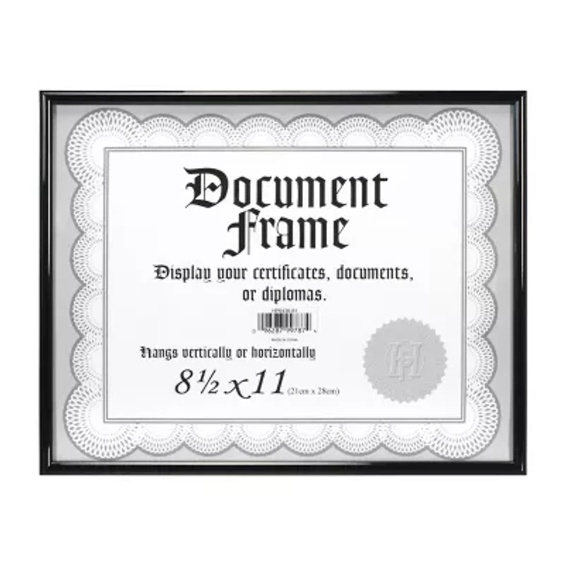 Add a touch of modern style to any wall with this profile document frame with black finish. This stylish frame is the perfect way to display your treasured document or any image no thicker than 1.5mm. The frame holds any vertical or horizontal 8.5"x 11" document or certificate. The frame is constructed of sturdy and lightweight PS moulding. Attached hardware makes hanging easy. The frame includes durable glass that will protect and showcase your beautiful documents for years to come. Simple to load with swing tabs and a removable back spacer. Celebrate your precious documents with this Malden international designs metro 8.5 x 11 document frames with black finish. Perfect for any home or the office, these frames will add new life to your space. The perfect gift for graduation!