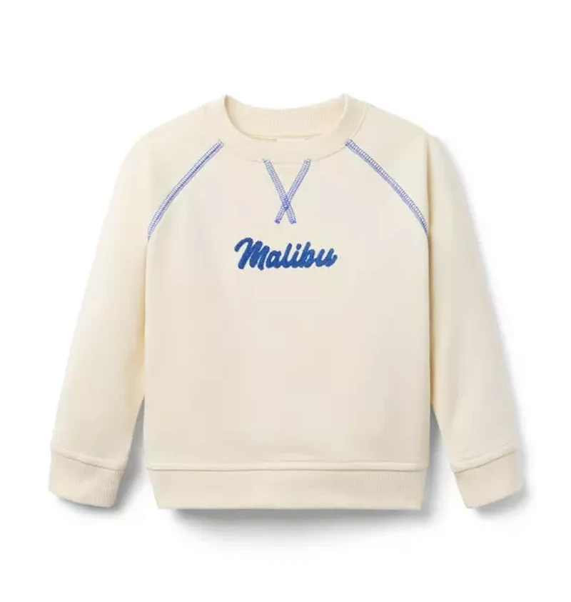Inspired by breezy beach days, our French terry sweatshirt is perfect for vacations or just because. With an embroidered Malibu design, ribbed trim and contrast stitching details. 60% Cotton French Terry/40% Polyester Long Sleeve Machine Wash, Inside Out; Imported
