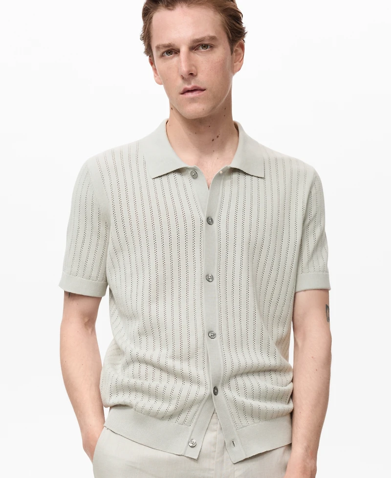 Lend texture to soft silhouettes with the Cotton Blouse With Openwork Detail from Mango. Made from cotton fabric, this blouse features openwork design, straight silhouette, shirt collar, front button closure, short sleeves, and ribbed collar, sleeves and hem.