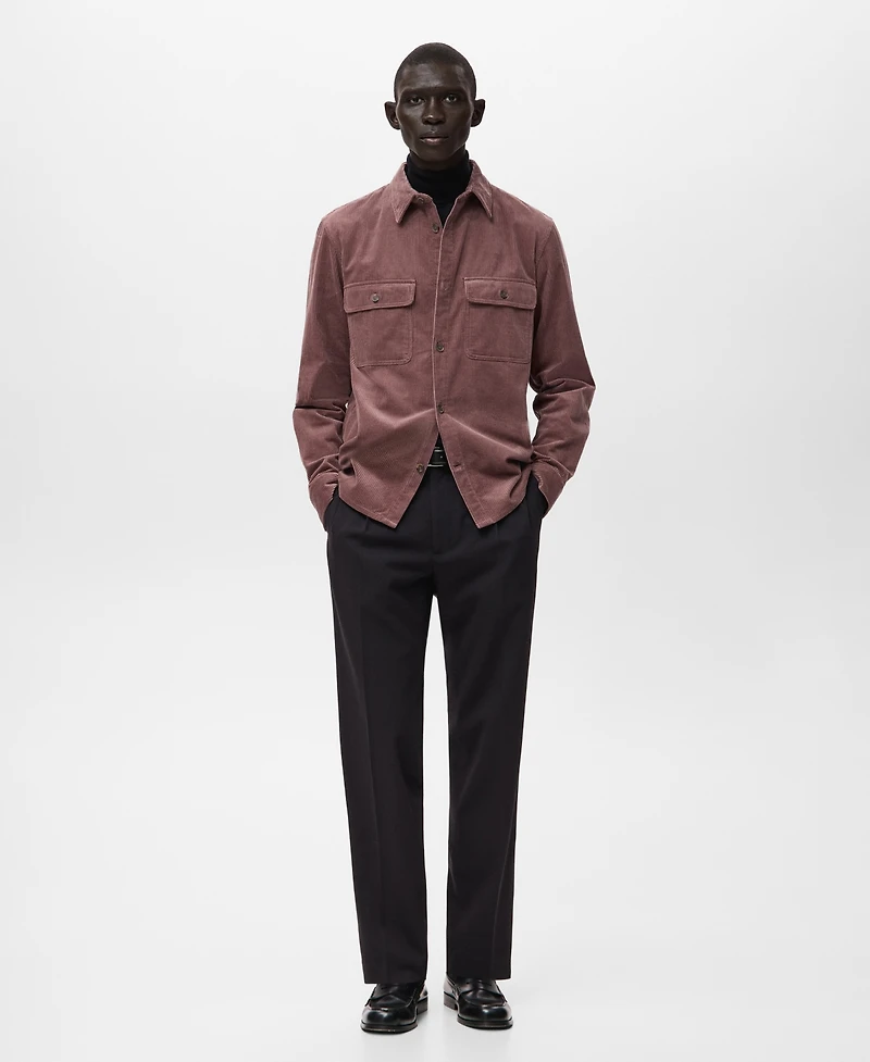 Layer transitional looks with the Corduroy Overshirt with Pockets from Mango. Crafted from cotton corduroy fabric, this overshirt features regular fit, shirt collar, chest flap pockets, long sleeves with buttoned cuffs, and front button closure.