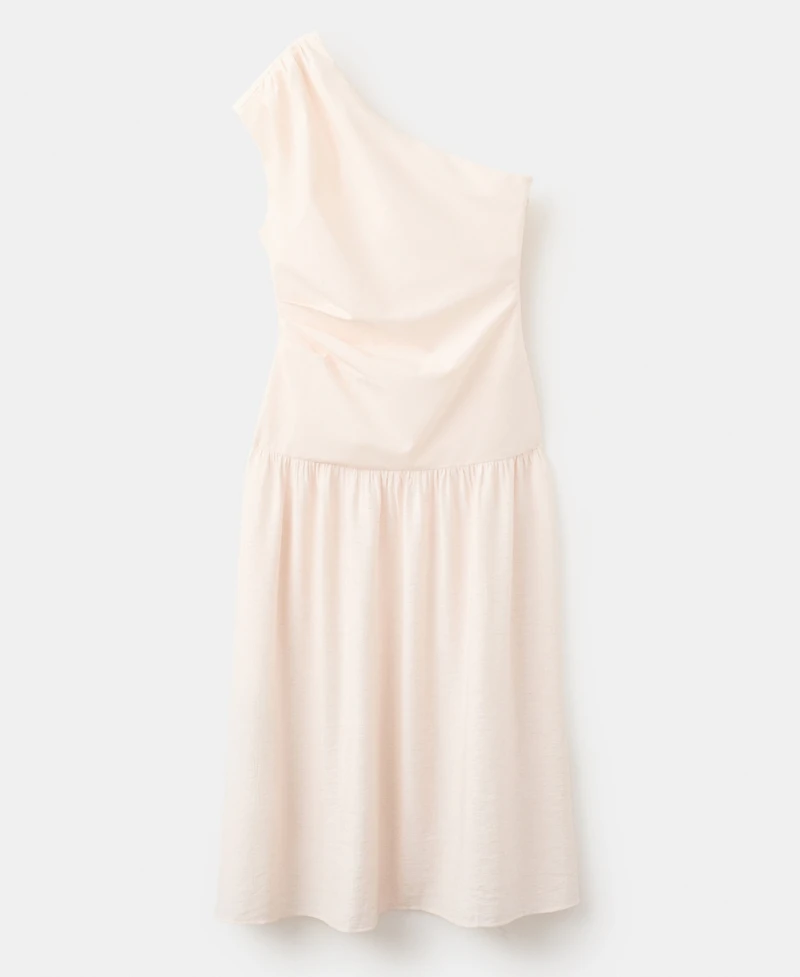 Creating directional flow, this Asymmetrical Pleated Dress from Mango stands out with modern lines. Made from cotton and lyocell blend fabric, this midi dress features A-line silhouette, asymmetrical neckline, sleeveless cut, side ruffles, and side zip closure. With a history spanning four decades, Mango is one of Europe's leading fashion brands. From Barcelona, on the banks of the Mediterranean, they delight the world with their fashion proposal and lifestyle. Mango's creative team works every day to translate fashion trends into their own language, which they deliver to customers in a personalized way while paying attention to detail.