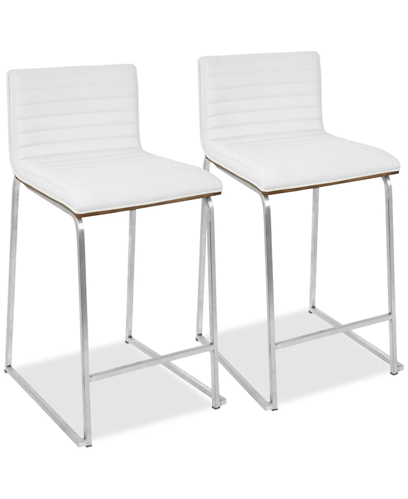 Bring modern, elegant style and comfort to your dining space with the soft, pleated faux leather seats, wood accented backs and sleek metal frames of this pair of counter stools.