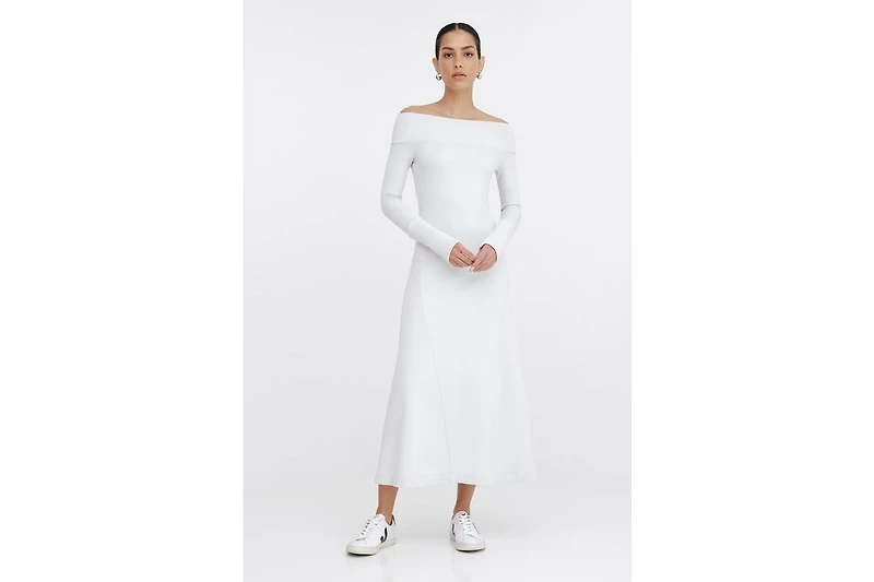Meet the Tilly Dress from Marcella. In lightweight french terry, this boat-neck silhouette features a fitted bodice and soft a-line skirt. Double side seams at the waist create flattering triangular shapes, while ribbed detailing at the neckline and cuffs offer a dose of edge.