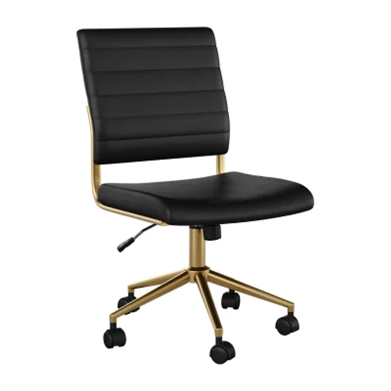 The Martha Stewart ivy armless office chair pairs traditional design with clean lines to instantly update your work space. This faux leather desk chair features a polished brass frame that adds elevated sophistication to a classic look. A pneumatic height adjustment lever tucked beneath the 360� swivel seat offers a custom seating experience to keep you comfortable throughout your workday. Assembly is easy with the included tools and step-by-step instructions.