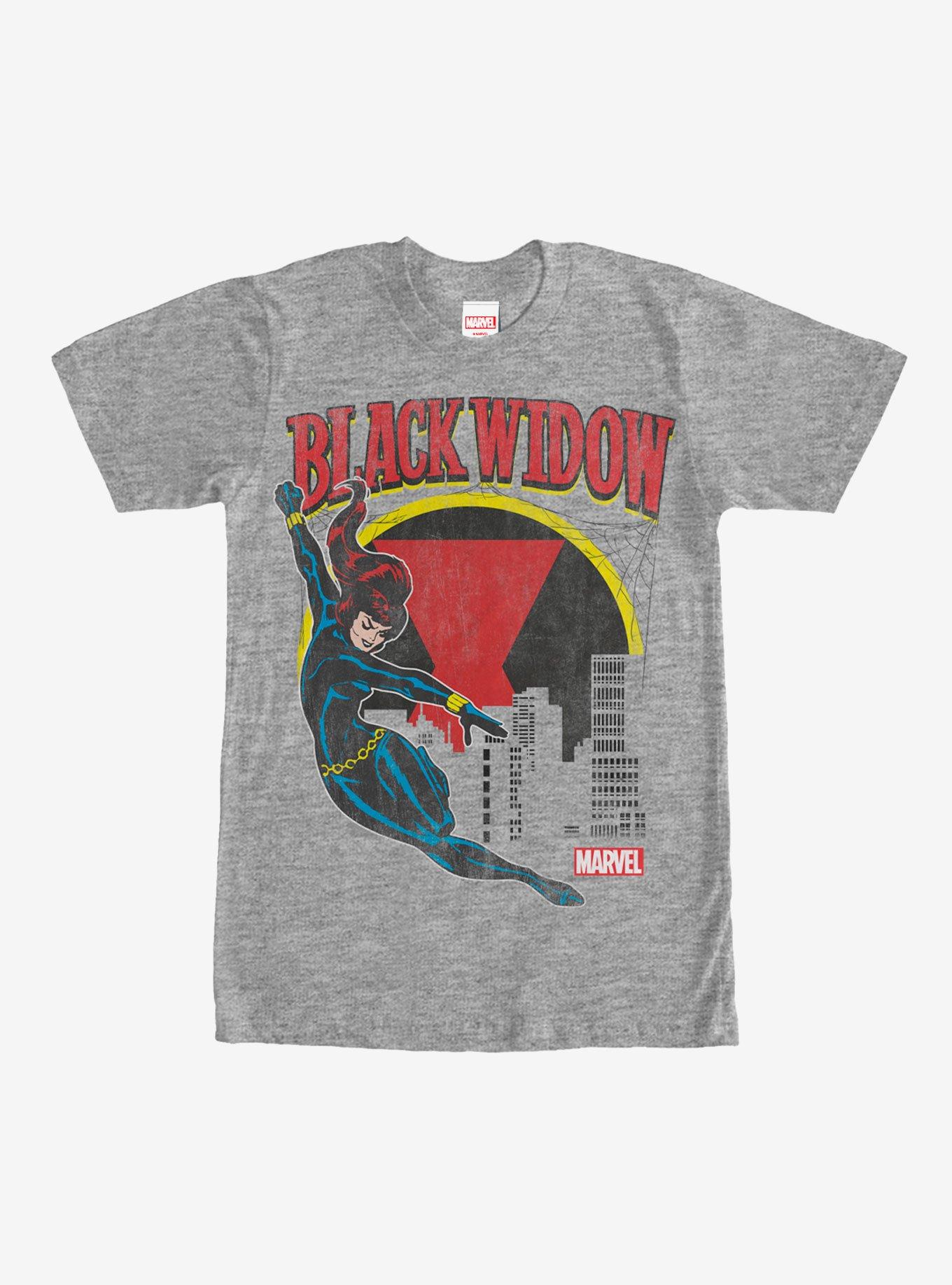 Like her namesake, the Black Widow spider, Natasha Romanova can lurk in the shadows and attack at a moment's notice with the Marvel Black Widow Web Slinger Heather Gray T-Shirt. This gray shirt features a distressed print of the Black Widow flying through the air over a cityscape with a red hourglass and "Black Widow" in bold letters behind her. 60% Cotton, 40% Polyester.