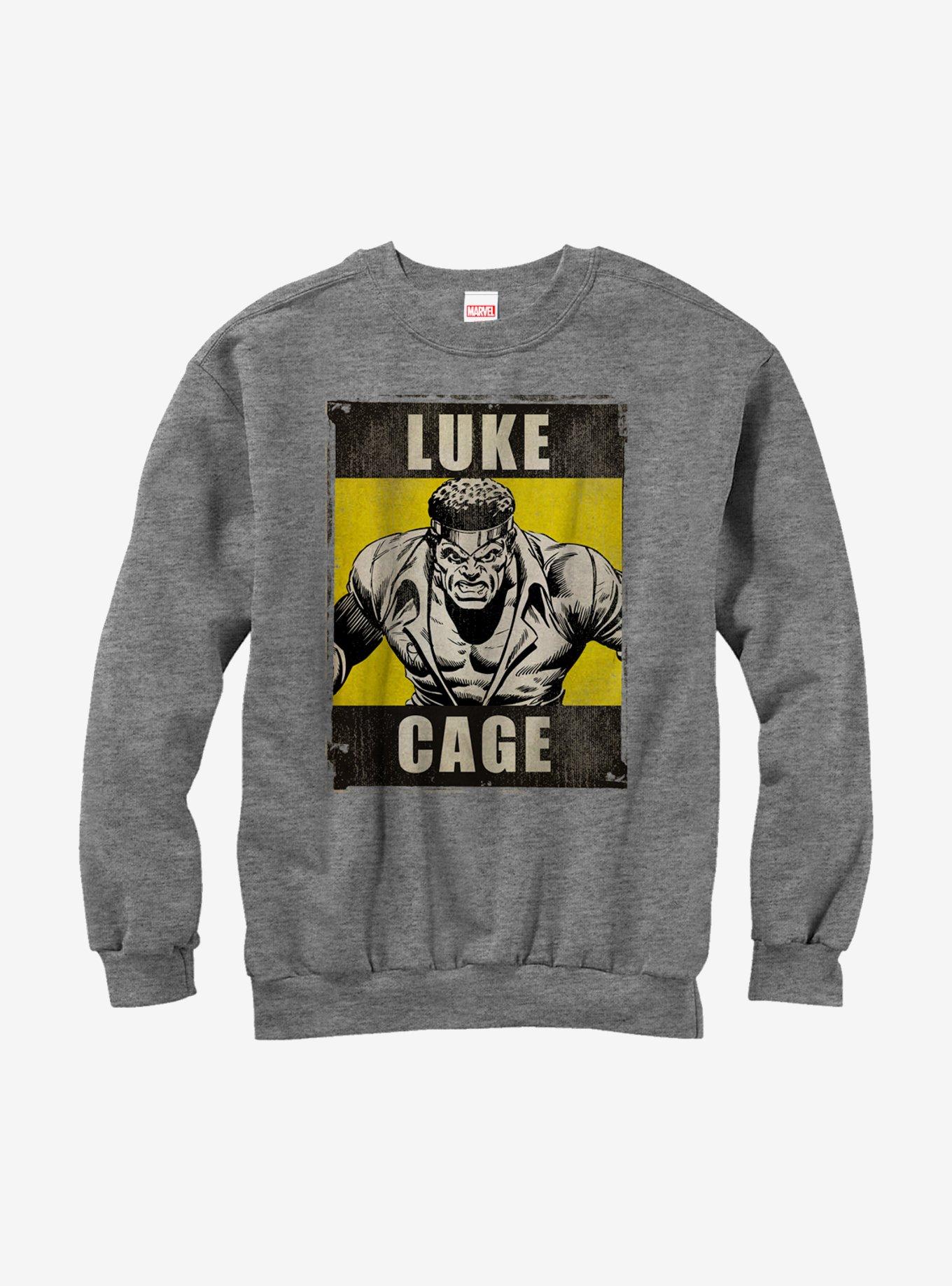 Sign up for Marvel's Heroes for Hire with Luke Cage because it's time to save the world! A distressed, vintage-style print shows the fierce Luke Cage, a.k.a. Power Man, printed on the front of this grey sweatshirt.