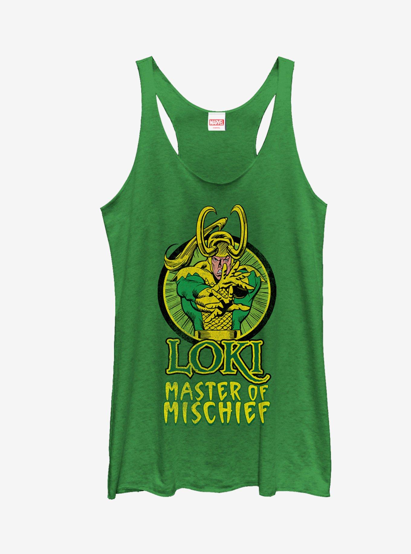 If you're feeling mischievous then the Marvel Loki Master of Mischief Heather Green Racerback Tank Top is the perfect shirt for you! Thor's sneaky brother, Loki, is shown in his iconic horned helmet with "Loki Master of Mischief" in distressed print across this awesome green Loki tank top! 50% Polyester, 25% Cotton, 25% Rayon. Designed with raw-edge hems.