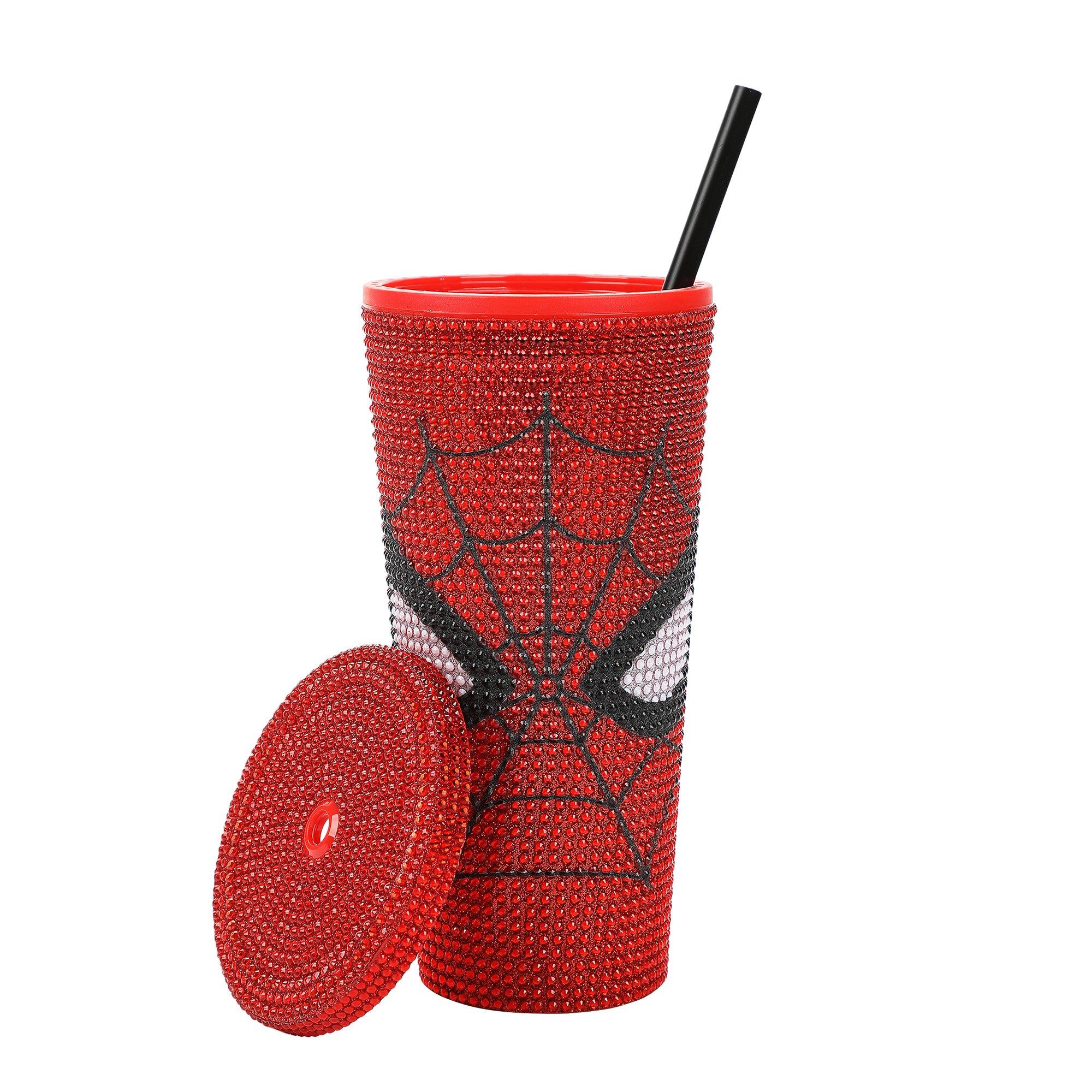 Make sure you stay hydrated while fighting crime with this acrylic travel cup! Featuring Spider-Man's iconic mask printed on the front and red rhinestone detailing allover. Comes with a screw-on lid and reusable straw.