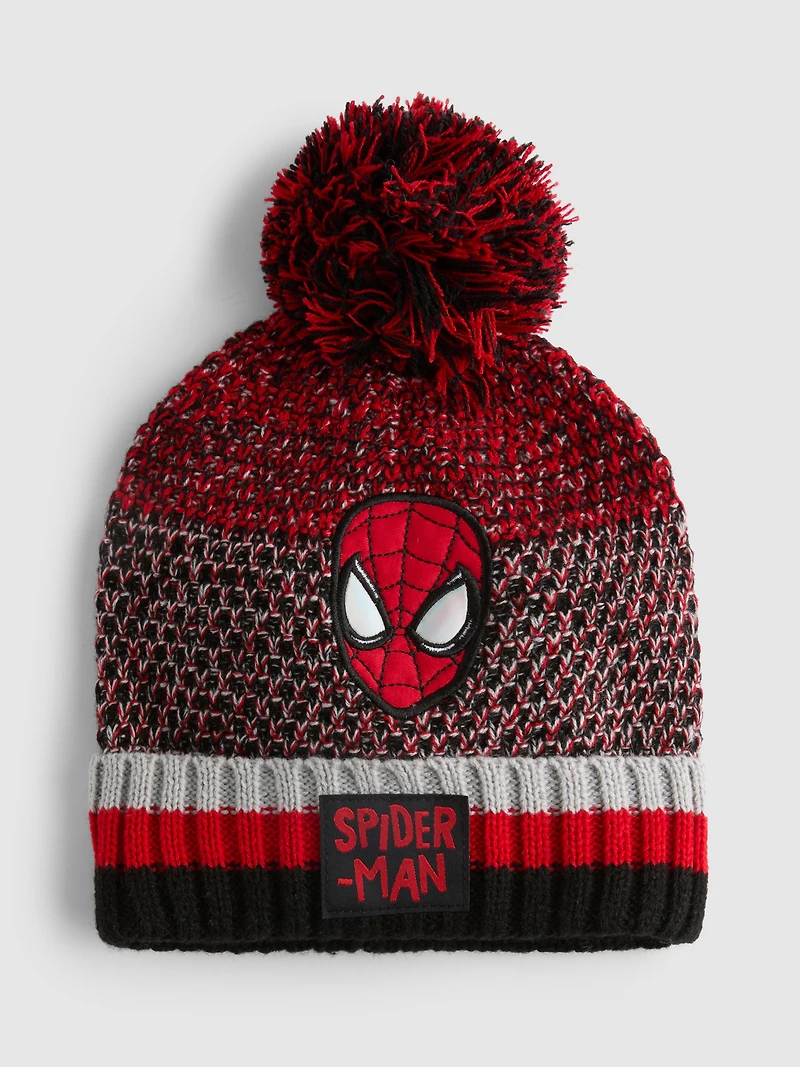 A pom-pom beanie hat with a Marvel Spider-Man character design