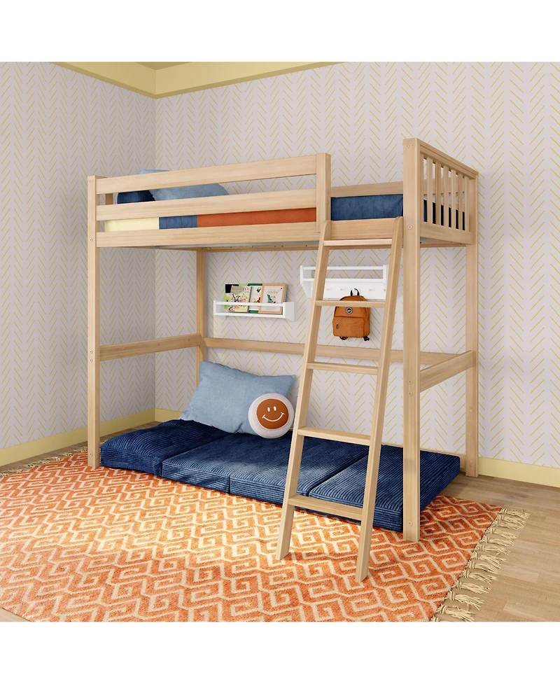 Get a fun and stylish sleeping space without sacrificing floor space with the Scandinavian Twin Loft Bed from Max and Lily. Kids loft bed features a sleek, modern design and a bright two-tone or clean, solid finish. Slatted headboard and color-matched hardware offer a clean look that perfectly complements any child's bedroom. Tall, 14-inch guard rails provide ample sleep security. Angled ladder with anti-slip rounded steps provides easy and comfortable access to the loft. The ladder can be installed on the left or right side, so the bed can perfectly fit your space. The durable, low Voc finish is easy to maintain. Flush, color-matching hardware maintains the clean look. Solid wood construction plus strong plywood slats and metal support bar provide a high 400-pound weight capacity. Accommodates standard twin-size mattresses and does not require a box spring or bunkie board. An 8-inch maximum mattress thickness provides the best fit.