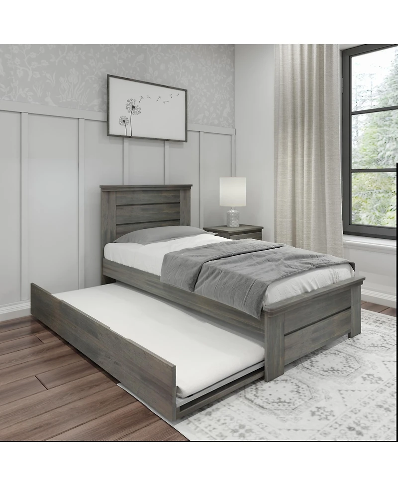 Bring the fun of the farm in with the Modern Farmhouse Twin Bed with Panel Headboard and Trundle from Max and Lily. With a fabulous barnwood finish and enhanced safety, this bed offers the perfect combination of fun and functional that kids and parents love. Added panel headboard creates a stylish look. The durable, low-voc finish makes this bed a safe choice for any kids room. Sleep and storytimes feel secure thanks to a 400 lb resting weight capacity. Coordinating twin trundle bed makes sleepovers simple. Solid New Zealand pine wood construction, solid plywood slats and metal support bar gives your kids sleeping space strong, durable support. Works with standard twin-size mattresses and does not require box springs or bunkie boards. Super safe design meets or exceeds Federal safety standards for kids furniture. Ships in two boxes with instructions and hardware included. 2+ adults make assembly quick and easy.