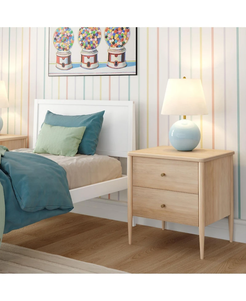 Bring timeless mid-century charm and smart storage to your child s room with the Max and Lily Hudson 2-Drawer Nightstand. Featuring gently tapered legs and antique brass knobs, this kids nightstand blends modern design with playful, kid-friendly character. Flush, color-matched hardware adds a clean, finished look that grows beautifully with your child s style. Crafted from knot-free, solid pine and engineered wood, this solid wood nightstand is built to last through years of bedtime stories and sleepovers. The clean, low-voc finish supports a healthier indoor environment, making it a safe and durable choice for any kids bedroom. Two roomy, easy-glide drawers keep bedtime essentials like books, flashlights, and favorite toys neatly tucked away, while the spacious top surface is perfect for lamps, decor, or nighttime must-haves. The securely fastened knobs make opening and closing the drawer simple for little hands.