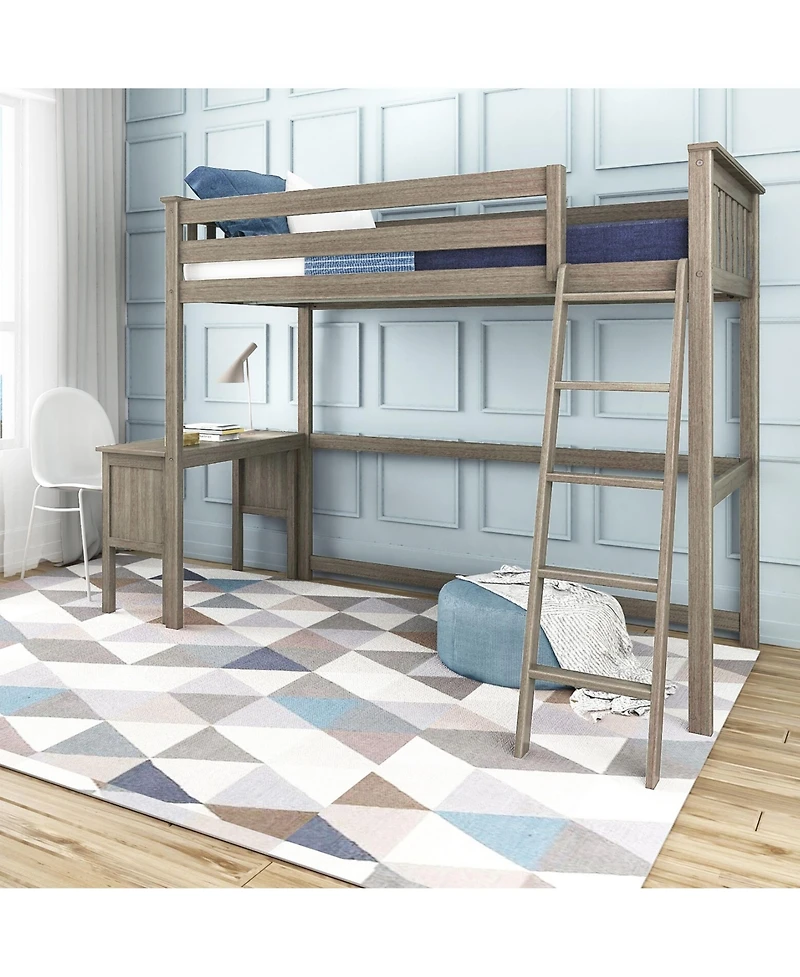 Get a chic sleep and study space without sacrificing floor space with the Twin High Loft Bed from Max and Lily. Clean modern lines and neutral finishes give this bed a classic look that works with any decor or style. The desk attaches easily to the loft for the perfect reading or study area and can be used outside or underneath the bed. Tall, 14-inch guard rails provide ample sleep security. Angled ladder with anti-slip rounded steps provides easy and comfortable access to the loft. The ladder can be installed on the left or right side, so the bed can perfectly fit your space. The included desk is perfect for studying and can be attached underneath or on the outside of the frame. The durable finish is easy to maintain. Flush, color-matching hardware maintains the clean look. Solid New Zealand pine wood construction plus strong plywood slats and metal support bar provide a high 400-pound weight capacity.