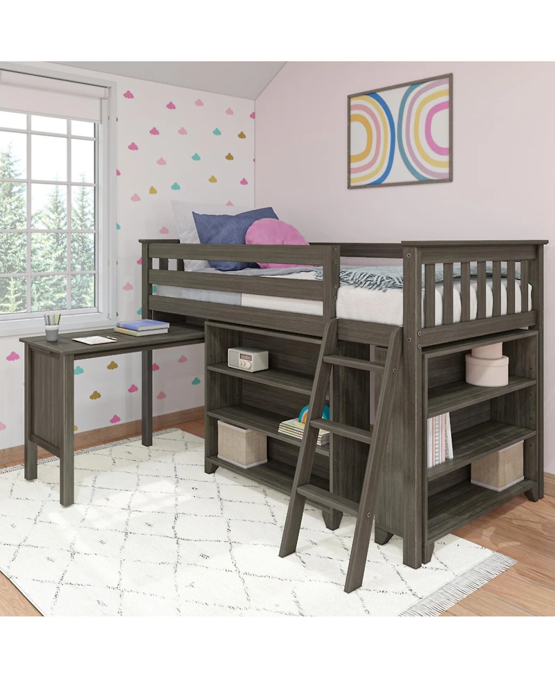 The Max and Lily Twin-Size Low Loft with Pull-out Desk and 3-Shelf Bookcases perfectly combines fun and function. The knot-free, solid wood bed frame adds strength and stability. This low loft bed uses a durable finish ideal for a clean and healthy home. Only 50 inches high, this low-profile loft bed is great for smaller spaces and safe for younger children. Two 3-shelf bookcases provide storage for everyday items. A pull-out desk is perfect for studying, creating art, or as a bedside table. This loft bed features 14-inch guardrails and safely fits standard mattress sizes. A ladder with rounded edges offers comfortable, easy climbing, and attaches to either the left or right side of the bed. The slatted headboard and footboards and flush, color-matched hardware give these kids loft beds a clean, modern look. Instructions, slat roll, tools and hardware are included.
