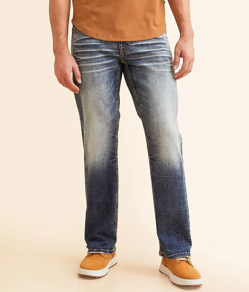 Regular fit bootcut jean Performance stretch fabric for a higher level of flexibility Low rise, 18" bottom opening Faux flap back pockets Destruction details Zip fly