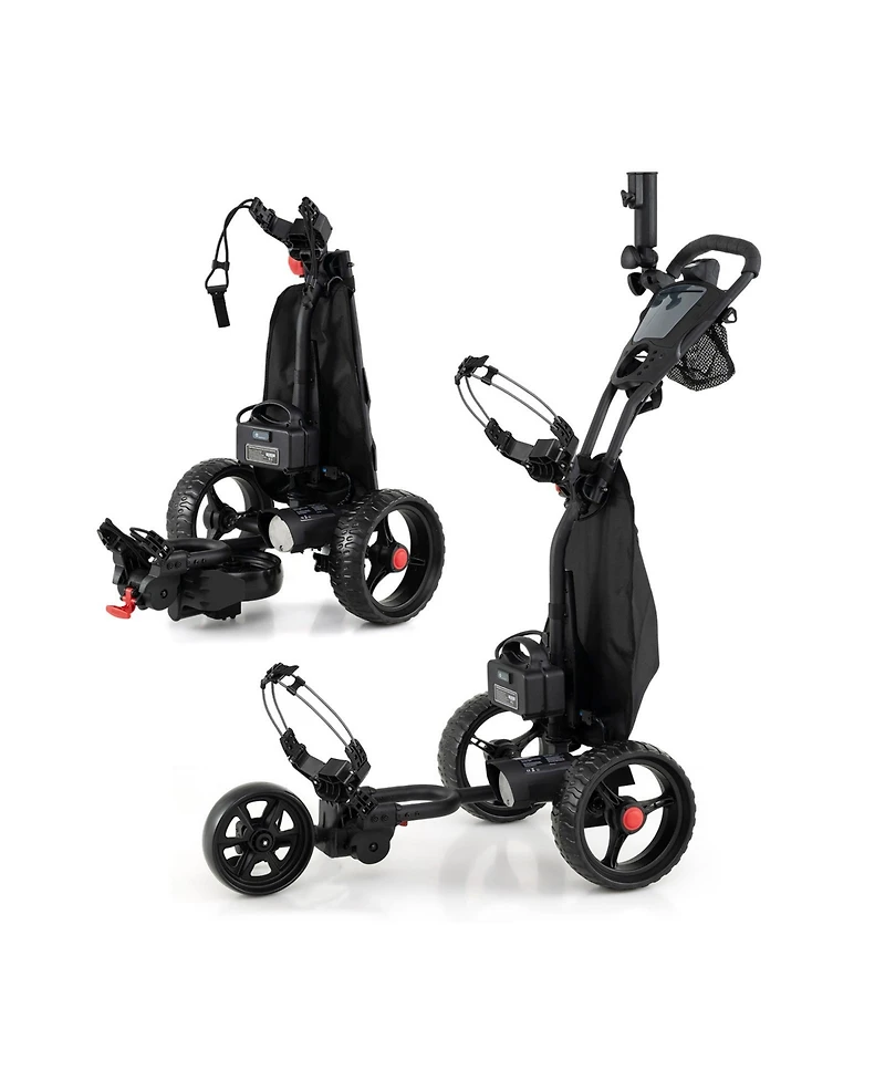 Upgrade your round with an electric golf push cart designed for smooth, powered walking. It features a rechargeable battery built for up to 18 holes and offers 9 speed settings to match your pace. The adjustable handle height and non-slip grip provide comfortable control, while the digital display shows speed and battery level. Storage includes a detachable umbrella holder, drink holder, and a large cooler bag for essentials. Eva wheels and secure bag brackets help keep the cart stable on a variety of course surfaces.