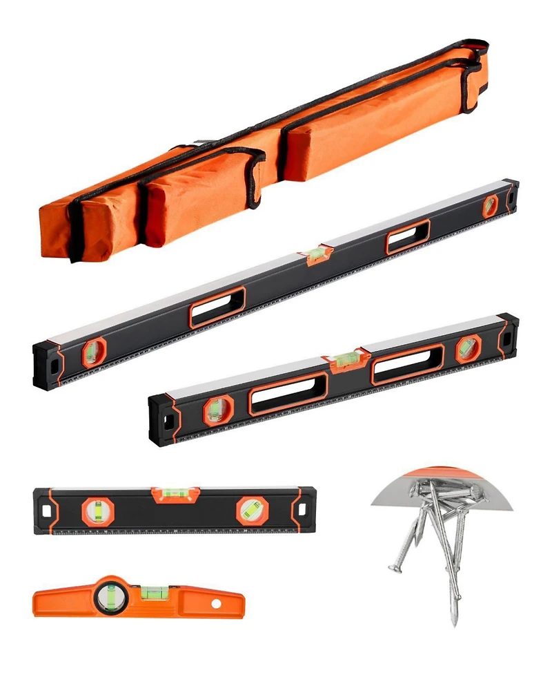 Tackle any leveling task with this 4-piece all-magnetic torpedo level set, including 10, 16, 24, and 48-inch levels for everything from tight spaces to long spans. Each level features 3 high-precision, fluorescent, light-up bubble vials for 45°, 90°, and 180° measurements, ensuring clear visibility even in dim work areas. The thickened aluminum alloy frame with a double-sided milled base delivers superior strength, wear resistance, and long-term accuracy, while the Abs + Tpe handle and metal anti-slip side pattern provide a secure, comfortable grip. Sae and metric scales are printed for quick, versatile measuring, and the dust-sealed nylon storage bag keeps the entire set protected, organized, and easy to transport for indoor and outdoor projects.