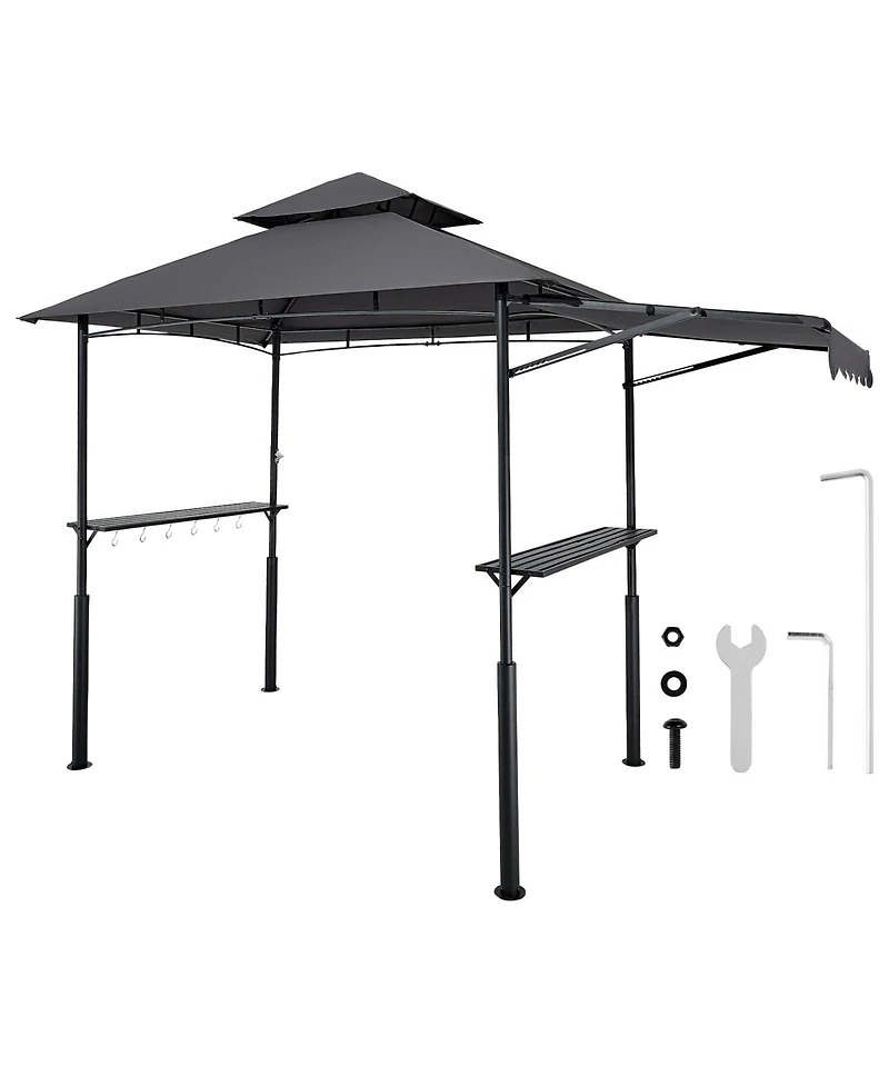 Transform your backyard into an all-weather grilling haven with this 8 x 5 ft grill gazebo. The double-tiered, four-pitch roof with an extra awning enhances airflow, quickly vents smoke, and expands shaded coverage, while the Uv-resistant fabric offers reliable sun protection and light rain resistance. Built with a heavy-duty, powder-coated Q235 steel frame, this metal Bbq gazebo stands strong against rust and deformation, staying secure with included ground plates and stakes. Thoughtful details like two side shelves, 8 tool hooks, and a built-in bottle opener keep everything you need within reach, creating a fully equipped Bbq station. Spacious enough for 2–4 people, it s perfect for patios, decks, gardens, and poolside gatherings, and assembles quickly so you can get straight to the fun.