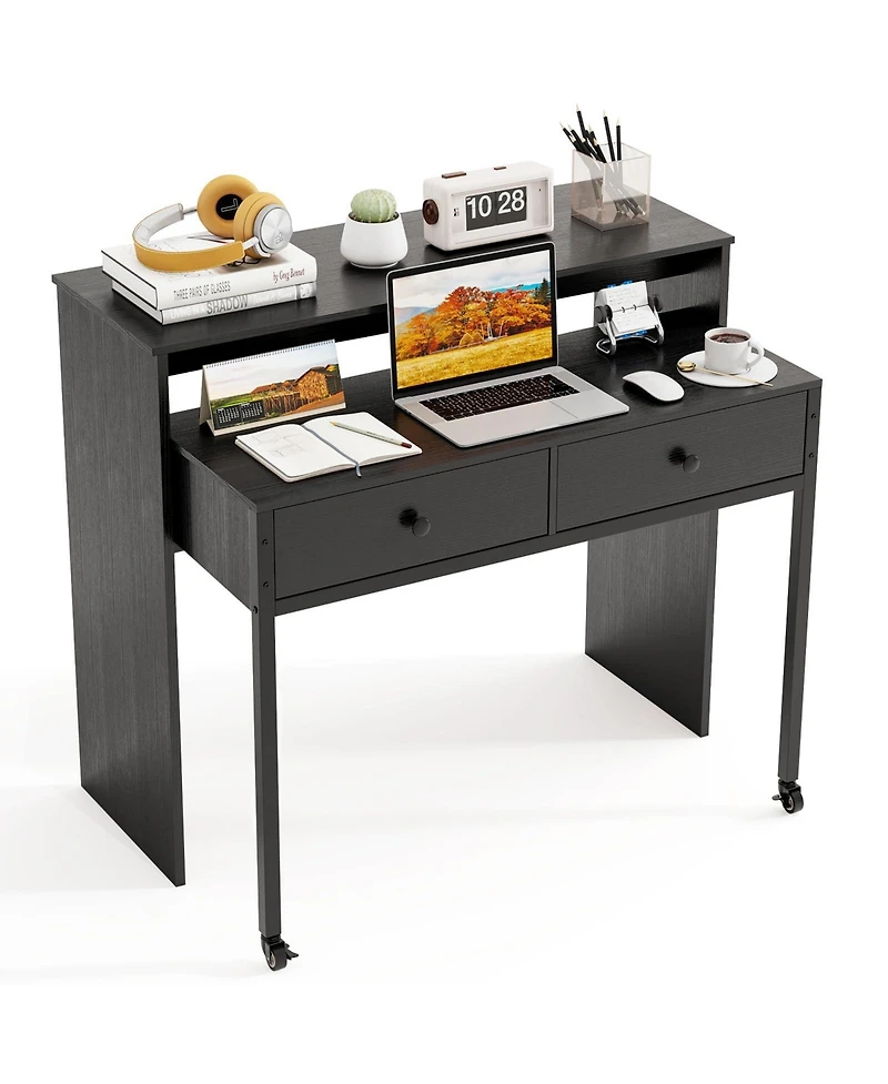 Mecale Extendable Rolling Computer Desk with 2 Drawers, Convertible Home Office Writing Desk