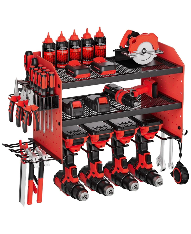Maximize your workspace with this 3-layer Power Tool Organizer Wall Mount, designed to keep your drills, batteries, and hand tools neatly stored and always within reach. Featuring 4 dedicated drill slots, an adjustable middle shelf, and side pegboards, it offers flexible storage for everything from drivers to wrenches. The premium carbon steel frame supports up to 100 lbs and is finished with a rust-resistant powder coating, while mesh shelves promote airflow to keep tools cool. Measuring 23.31 x 8.66 x 12.01 in, this compact, matte bright red rack mounts easily to concrete, brick, wood, or studs, making it ideal for garages, workshops, and workbenches.