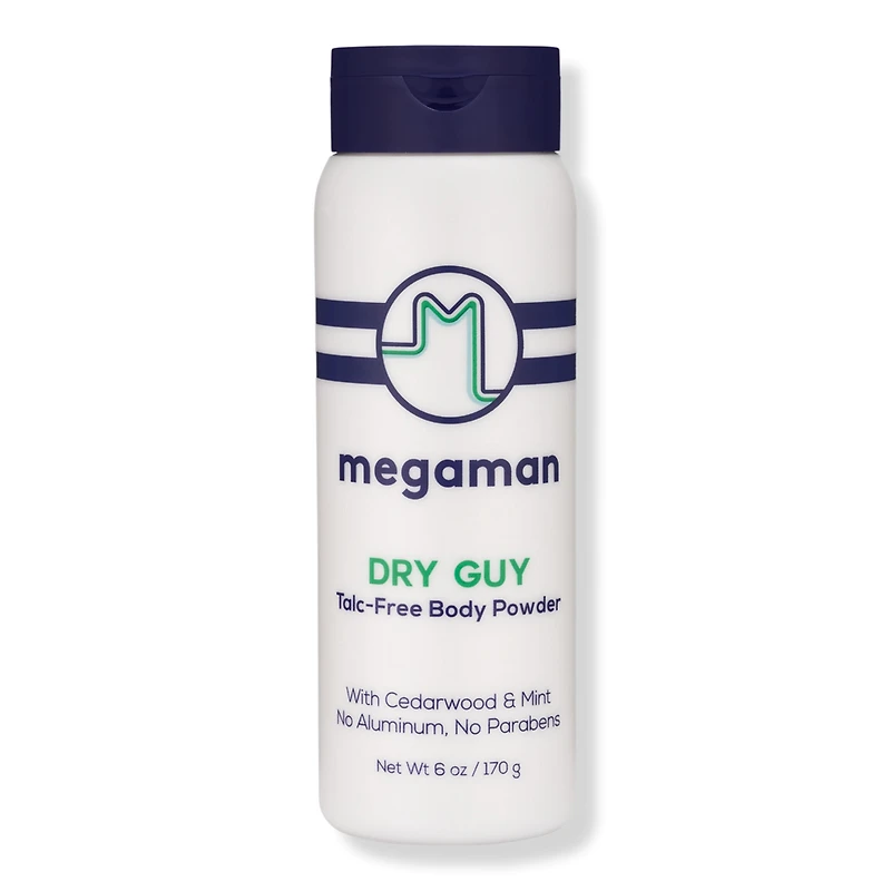 MEGAMAN DRY GUY COM 6OZ. Benefits: Prevents sweat from trickling, puddling, pooling & seeping through clothes. Natural powder is free of aluminum & talc for a safe sweat solution. Ultrafine formulation has a smooth, matte finish. Cedarwood & mint lend a light, natural scent. Key Ingredients: Lavender's natural antiseptic properties help prevent bacteria. Aloe soothes skin. Antioxidant-rich chamomile calms redness & irritation. Corn starch absorbs wetness. Formulated Without: Aluminum. Talc. Parabens. Phthalates. Sulfates. Synthetic fragrance.
