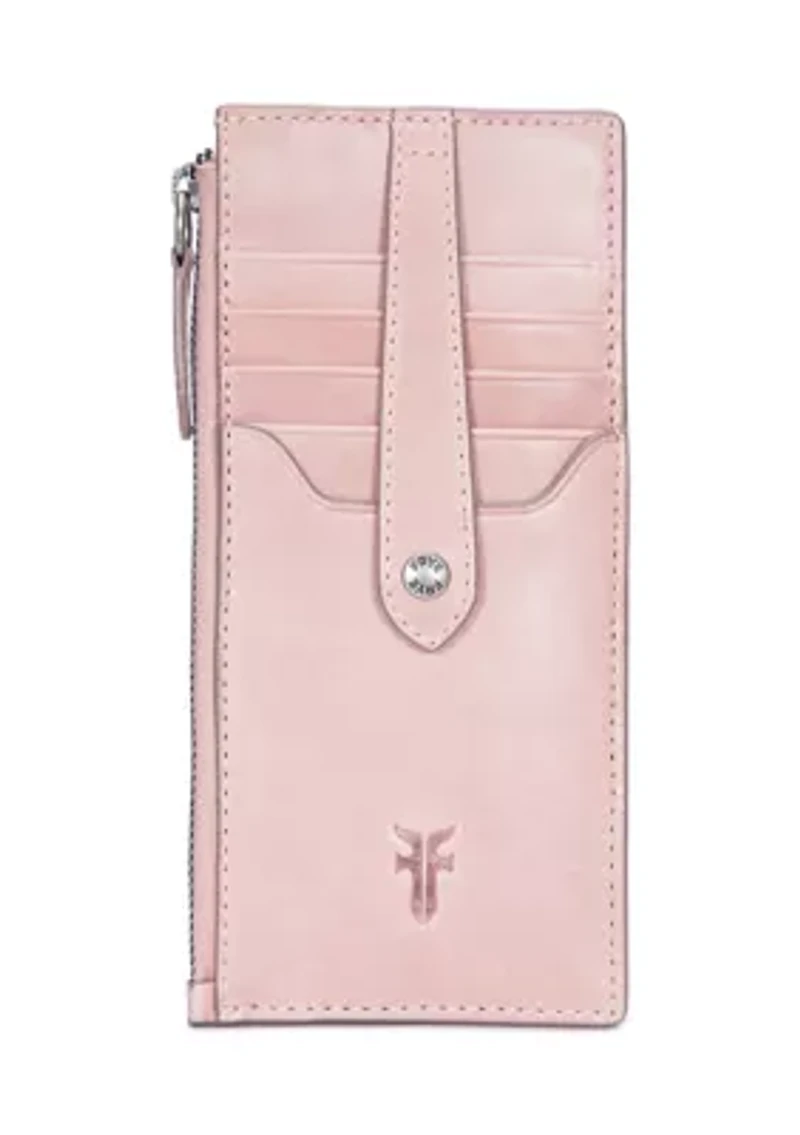 Woven from quality leather and featured in a classic silhouette, this sleek snap card wallet from Frye is an everyday essential. Magnetic snap closure, zip closure Exterior: top zip closure, credit card and slip pocket, ID window pocket Interior: credit card pockets Imported Product Specifications 7.5" L x 3.75" W x 0.5" D Material & Care Leather Wipe clean