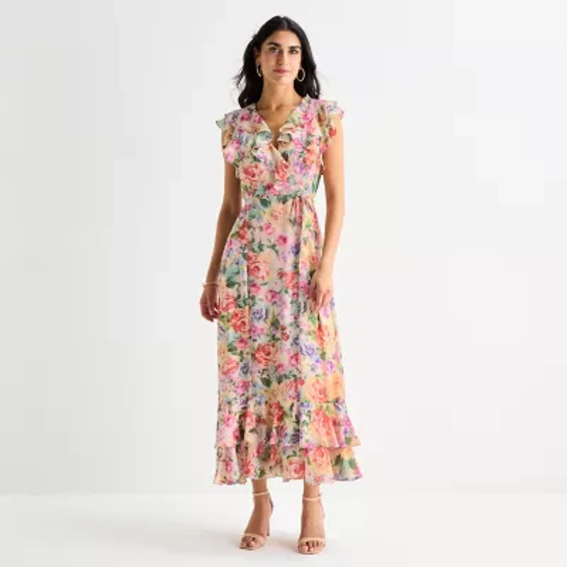 This floaty floral-print number from the Melonie T women's collection would be a chic choice for a wedding event or garden party. Made from chiffon, this sleeveless long dress has ruffled trims and a v-neckline. Wear it with sandal and sparkling jewelry pieces.