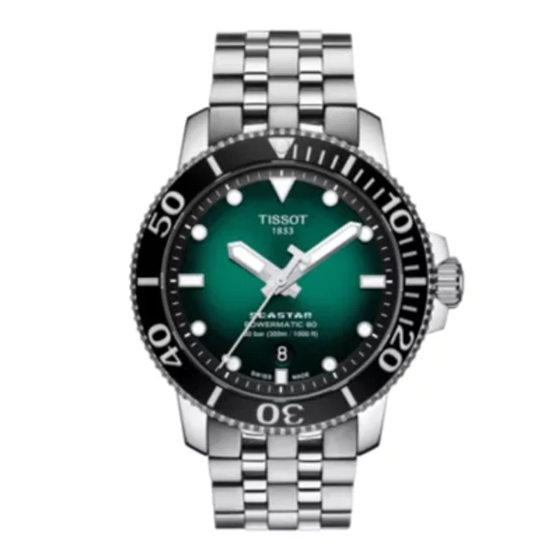 The Tissot Seastar 1000 is the ultimate watersport watch, with its high water-resistance up to a pressure of 30 bar (300 m/1000 ft), screw-down crown and caseback as well as its unidirectional ceramic bezel. Foldover clasp Analog dial Automatic movement Polished finish Date display Choking hazard Warranty available, Limited liability warranty, 2 Years of Warranty Switzerland Imported Product Specifications 43.00 mm 43.00 mm Material & Care Stainless steel Clean with a soft cloth.