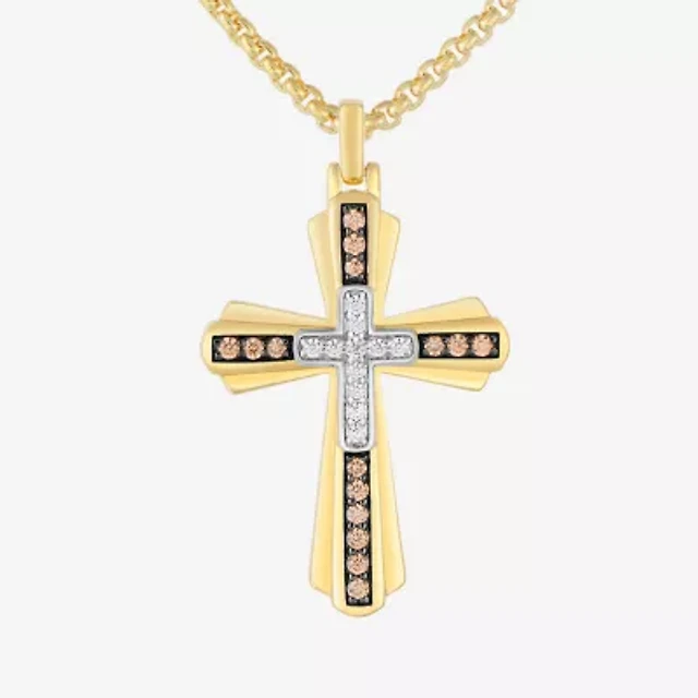 Mens 1/2 CT. T.W. Natural Champagne Diamond 14K Gold Over Silver Sterling Silver Cross 22 Inch Pendant Necklace