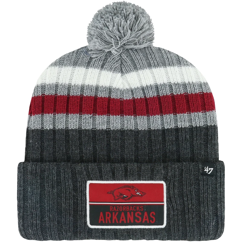 Men's '47 Charcoal Arkansas Razorbacks Stack Striped Cuffed Knit Hat with Pom in Franklin, TN