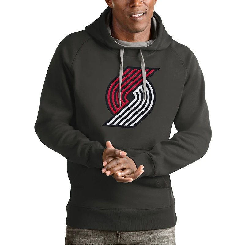 The Men's Antigua Charcoal Portland Trail Blazers Team Logo Victory Pullover Hoodie is the ultimate way to show unwavering support for the Portland Trail Blazers. This midweight hoodie features a cozy cotton-polyester blend, perfect for moderate temperatures. Embroidered Portland Trail Blazers graphics proudly display team spirit, while contrast drawstrings and inside hood add style. Whether cheering from the stands or hanging out, this hoodie keeps you comfortable and connected to the team you love.