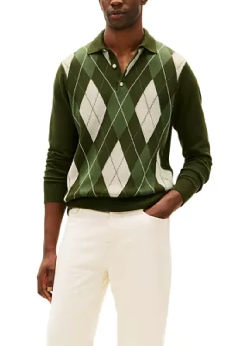 Classic prep meets bold statement in the Tommy Hilfiger Argyle Rugby Sweater. Crafted from soft cotton with a substantial hand feel, this sweater reimagines heritage rugby style with a striking argyle pattern across the chest for a modern collegiate twist. Pair it with denim or chinos for a look that transitions seamlessly from casual to polished. Button closure Button-down collar Long sleeves Argyle pattern Imported Material & Care 100% organic cotton Machine washable