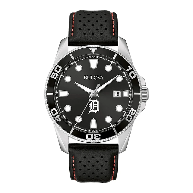 Men's Bulova Black Detroit Tigers Sport Leather Strap Watch