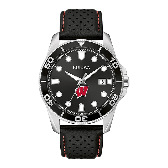 Men's Bulova Black Wisconsin Badgers Sport Leather Strap Watch