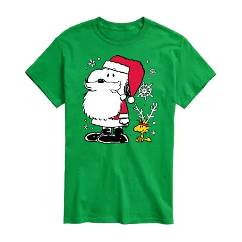 Peanuts Snoopy Santa Woodstock Reindeer Men's Short Sleeve Graphic T-shirt - Celebrate the holidays with the Peanuts gang! This Christmas-themed graphic apparel features Snoopy, Charlie Brown, and friends in festive cheer, perfect for adding a nostalgic, playful touch to your wardrobe.